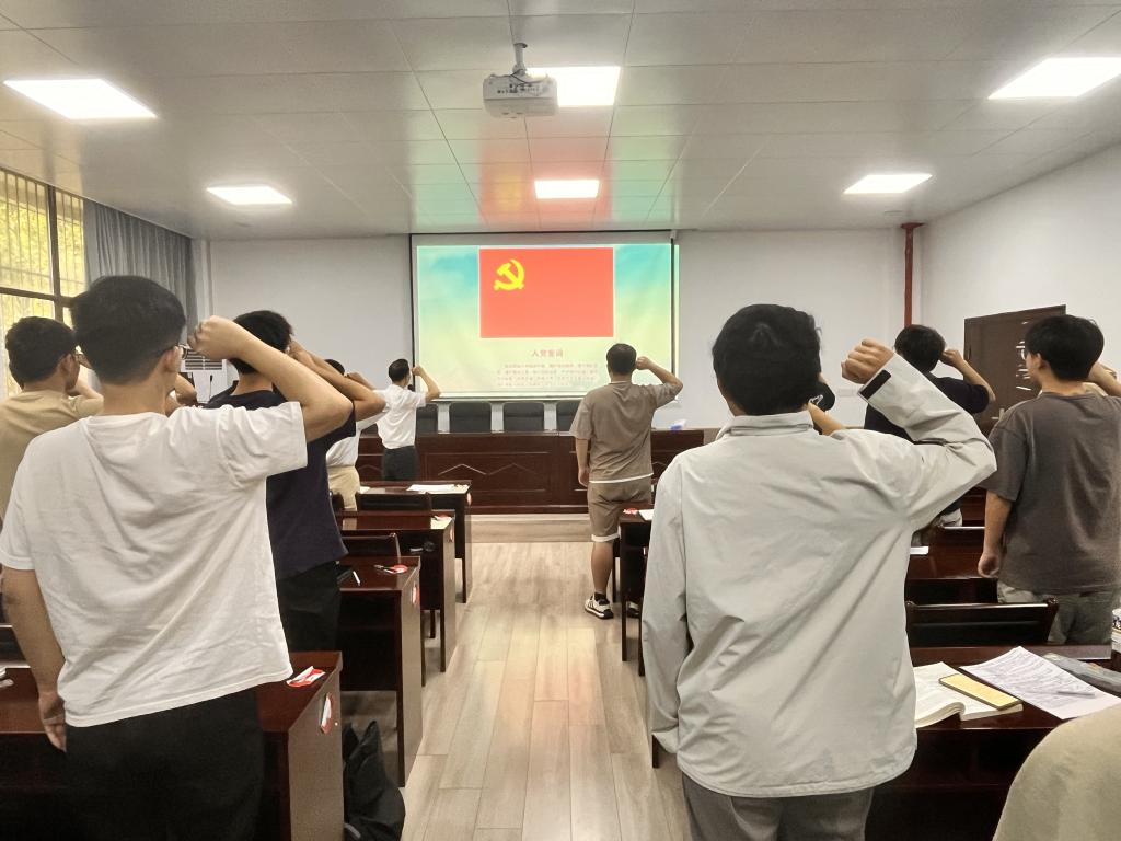 会上,丁忠利宣读了学院党委关于组织发展党员的批复,向新党员表示祝贺,并为他们佩戴党员徽章。全体新党员和老党员起立,面向鲜红的党旗,举起右拳,庄严宣誓,宣誓声音铿锵有力,彰显着每一位党员的信念和决心。