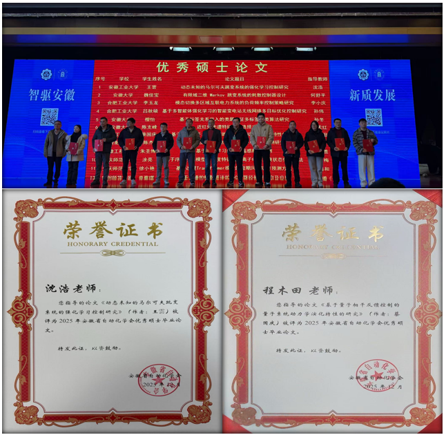 会上发布了2025年度安徽高校自动化专业教育领域的多项奖项,我院喜获安徽省自动化学会优秀硕士毕业论文奖、优秀本科毕业论文奖以及优秀青年人才奖。其中,硕士研究生王雲撰写的《动态未知的马尔科夫跳变系统的强化学习控制研究》(指导教师:沈浩)和蔡国庆撰写的《基于量子相干反馈控制的量子系统动力学演化特性的研究》(指导教师:程木田)获得优秀硕士毕业论文奖;本科生王文泽撰写的《基于代理模型的激波风洞膜片选型方法研究》(指导教师:费习宏)和孙泽林撰写的《基于光纤光栅的动态数字手势智能识别研究》(指导教师:钱牧云)获得优秀本科毕业论文奖;我院青年教师李峰获得安徽省自动化学会优秀青年人才奖。