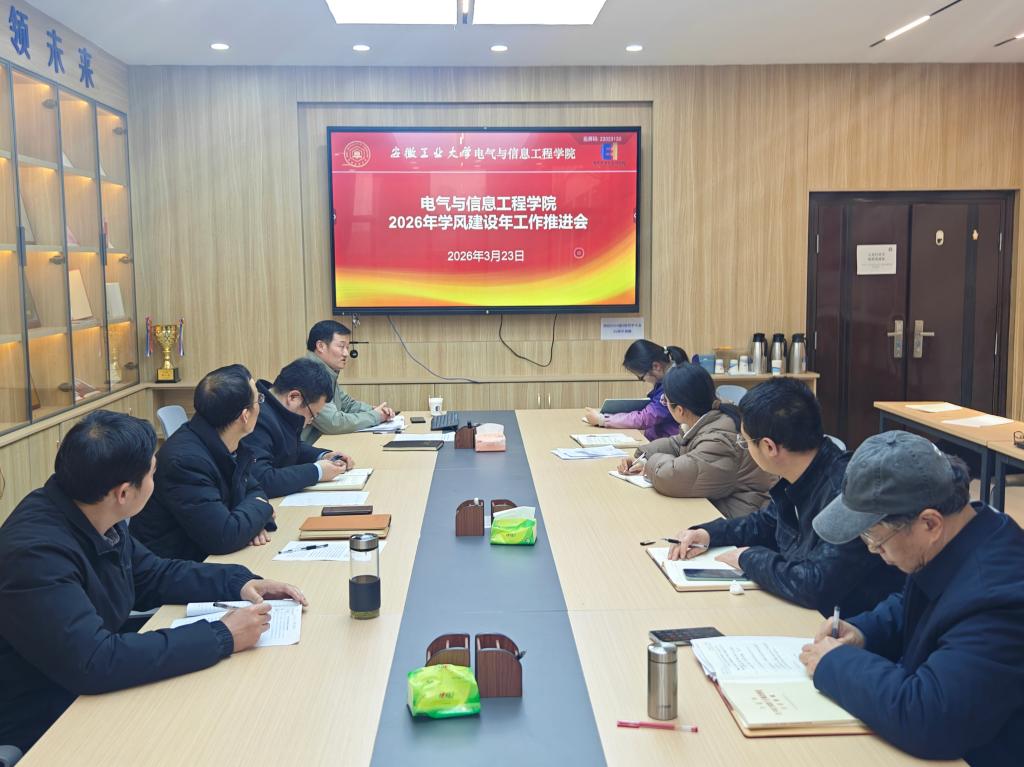 3月23日下午,我院在电气楼308会议室召开2026年学风建设年工作推进会。会议由学院党委副书记、纪委书记、副院长孔洋波主持,学院党委书记丁忠利、院长程木田、副院长张前进出席,各系室主任、支部书记、全体辅导员参会。