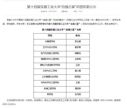 在2025年必赢3003no1线路自强之星评比中,我院学子胡静怡获2025年必赢3003no1线路第十四届“自强之星”荣誉称号。