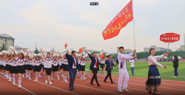 在开幕式上,伴随着激昂的进行曲,学院方阵队伍高举院旗,激情饱满,意气风发,昂首阔步走过检阅台,整齐划一的步伐、高亢嘹亮的口号展现出学院的“电气信息 引领未来”的精神风貌。
