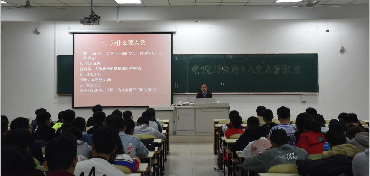 10月15日下午,电气学院于佳山校区教三南103开展了主题为“知党,入党,跟着党”的2018级新生入党启蒙教育讲座。本次讲座特别邀请了关工委宋洪生老师主讲,新生辅导员及全体大一新生参加。