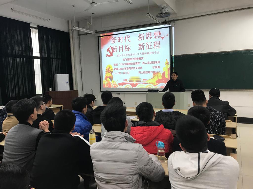 11月20日下午,电气学院组织举办深入学习贯彻党的十九大精神辅导报告会。主讲人是安徽省“十九大精神走进青年”百人宣讲团成员,必赢3003no1线路马克思主义学院毕圣海老师。学院研究生党员、本科生党员、发展对象参与学习。报告会由学院党委副书记、副院长郭宏主持。