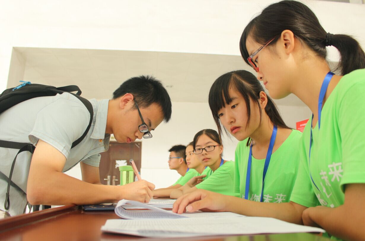 志愿者们早早就做好了准备。宣传横幅、指示牌、迎宾彩旗延插在道路两边、电气楼的四周。18日一早,志愿者们便在电气楼集合完毕。车站接待组的成员们赶在第一趟班车抵达马鞍山车站之前就做好了接站准备;前台接待组的志愿者们在报到处准备好了报名表和资料袋;引导组的志愿者们在各处做好每一班的站岗,随时为前来报到的参赛队伍提供各种帮助。即便是车站接待组的志愿者们在火车站出口顶着炎炎烈日站岗一上午,没有阴凉处或者可以坐着休息的地方,也不抱怨,喝了几口水之后便继续举起“接站人员”的牌子继续等待着到站的参赛人员。负责前台接待的志愿者们中午也没有休息、没有轮班的一直在报到处细心核实着参赛队伍的资料,为前来报到的参赛队伍解决好每一个细小的问题。