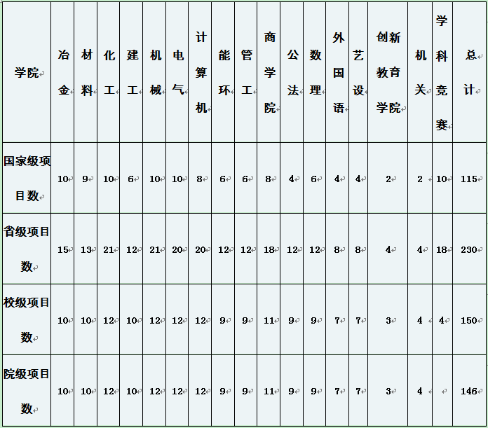 总结近几年各学院大学生创新创业训练计划项目实施及结题验收情况,经研究决定,各单位推荐项目数指标数如下:
