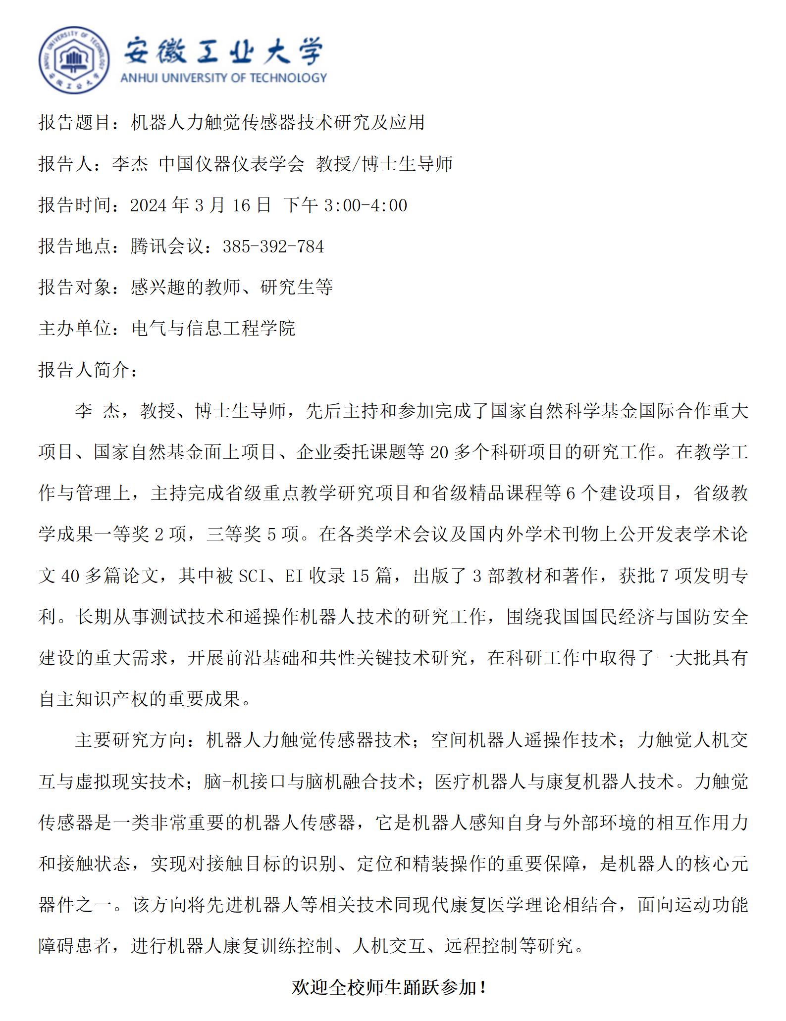 “谦之”学术讲坛之七十五-机器人力触觉传感器技术研究及应用