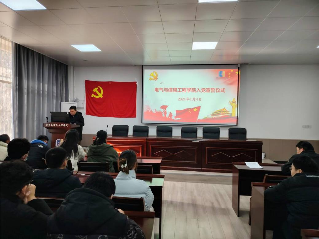 1月4日中午,电气学院在电气楼113教室举行新党员入党宣誓仪式。院党委副书记、纪委书记、副院长李克明、各学生党支部书记、各年级辅导员、2023年12月新发展的党员以及全体学生党员参加了仪式。